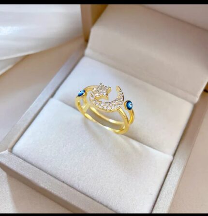 Gold Plated Crescent Moon Ring with Star and Blue Eye Design for Women