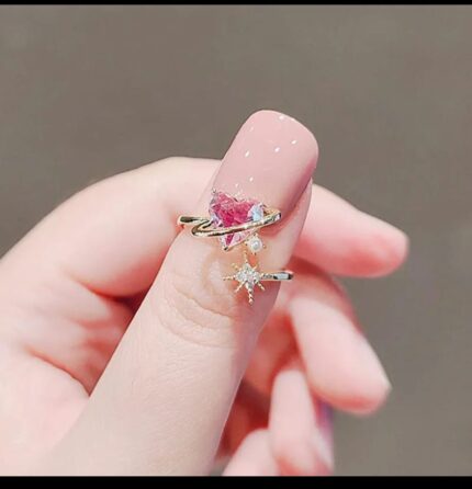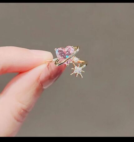Gold Plated Heart Shaped Ring with Pink Crystal and White Star Design for Women