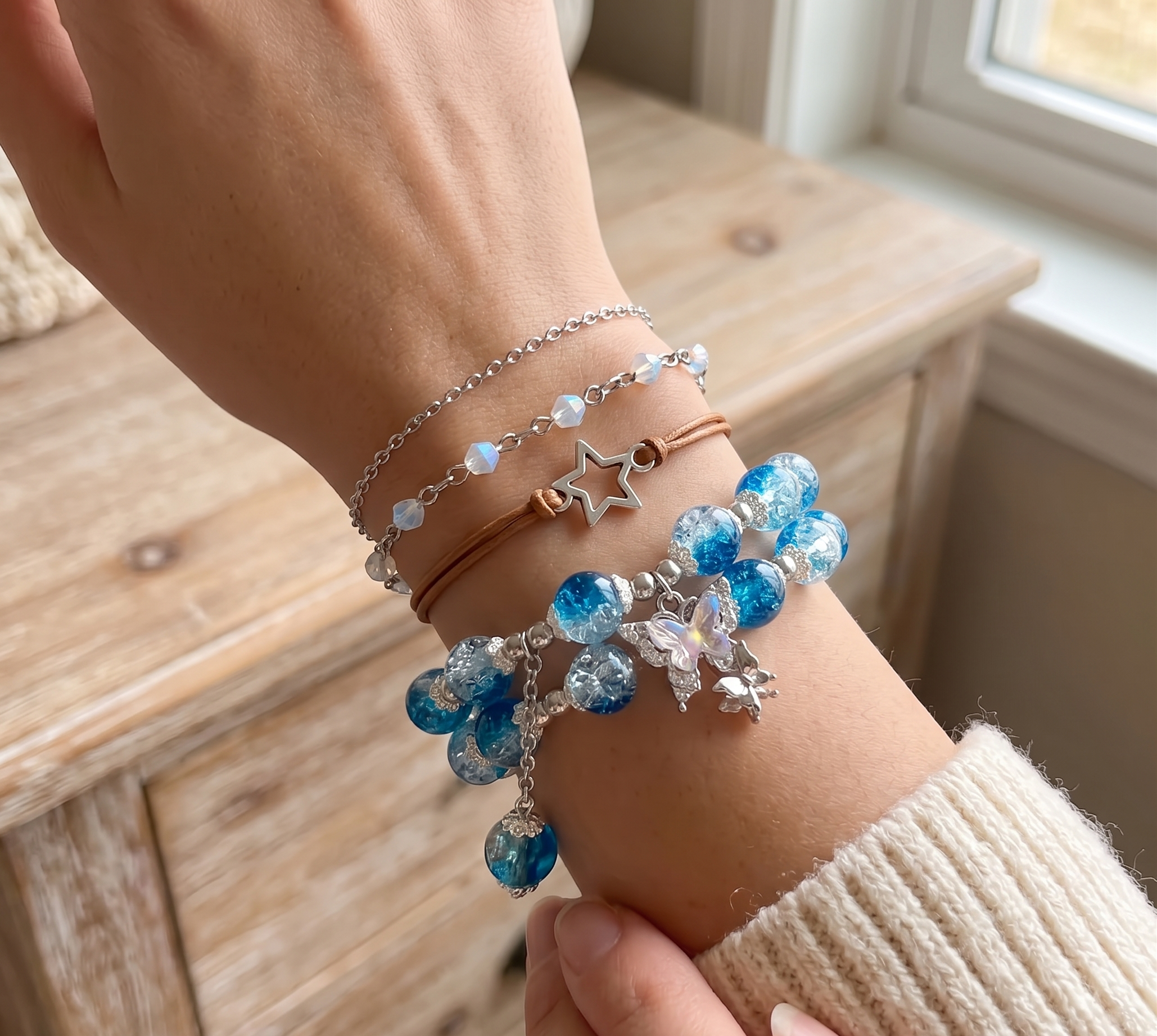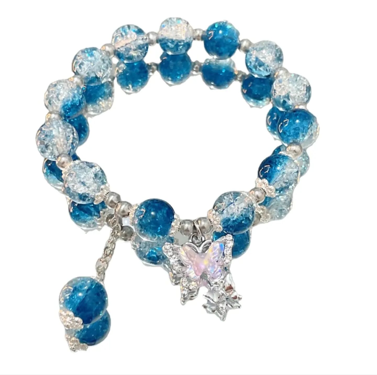 Blue crystal bead bracelet with butterfly charmβstylish, elegant, and eye-catching.