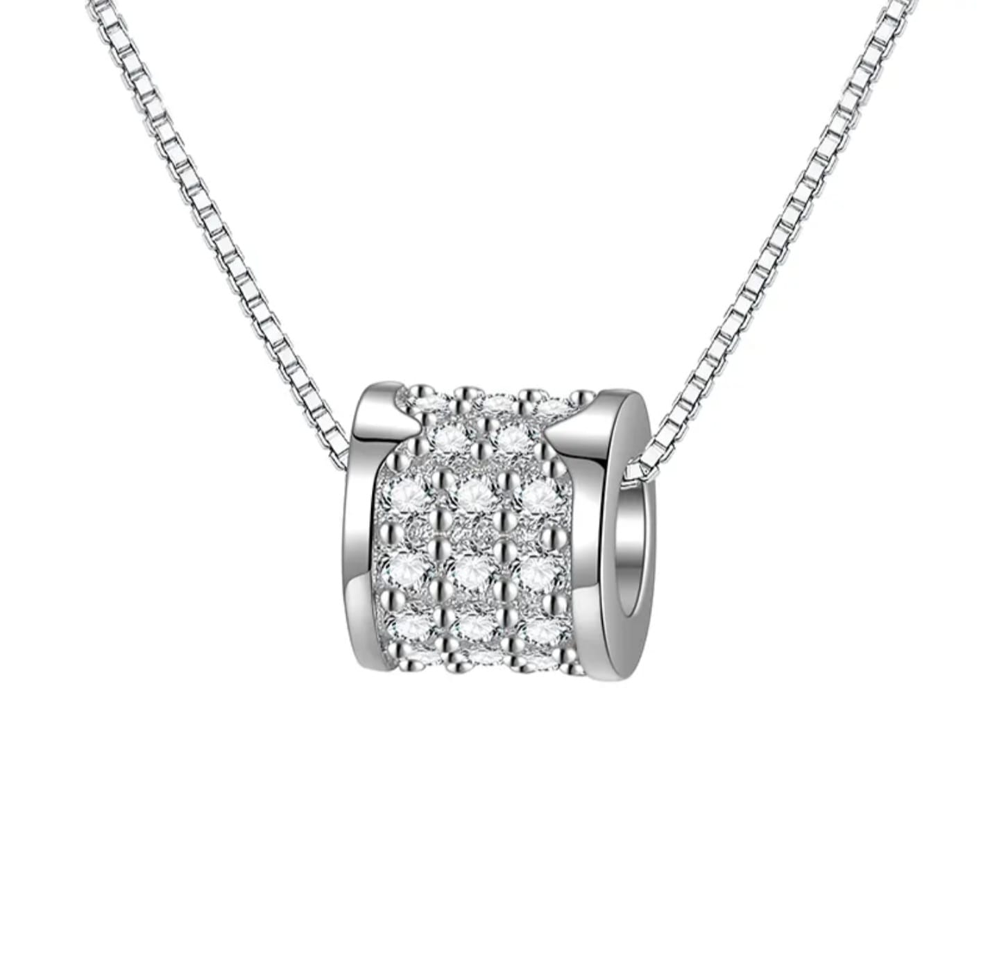 Elevate your everyday style with this crystal barrel silver pendant necklace. Designed with a sleek cylindrical shape, the pendant is adorned with shimmering crystals that reflect light beautifully from every angle.