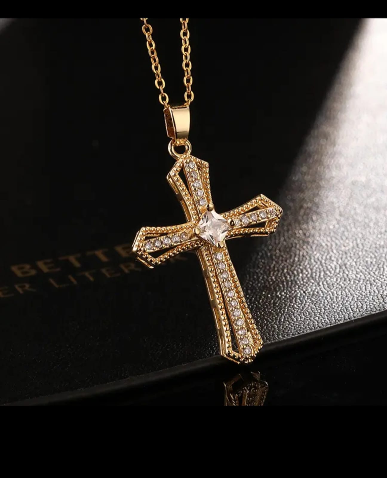 gold plated necklace, cross pendant, religious jewelry, women’s necklace, girls necklace, cubic zirconia necklace, fashion jewelry, party wear necklace, daily wear necklace, gold cross necklace, religious gift, festival jewelry