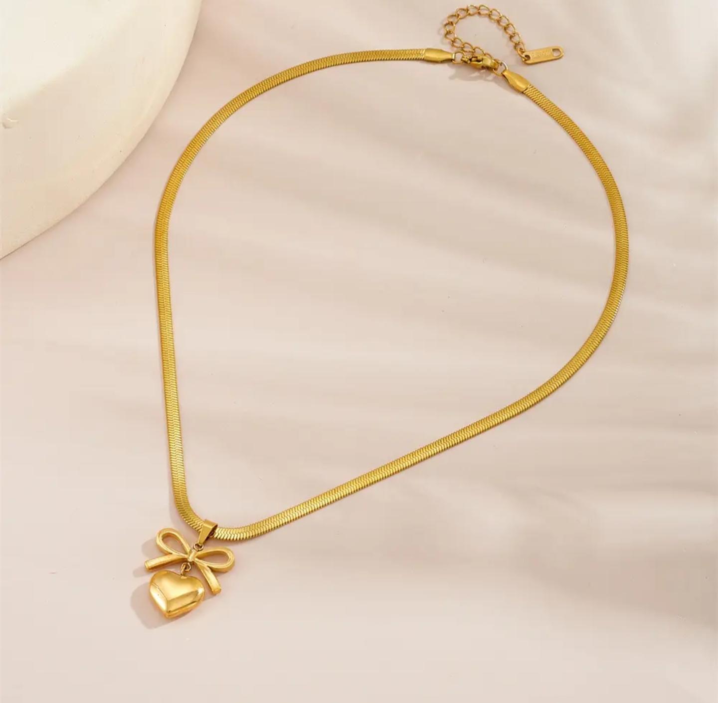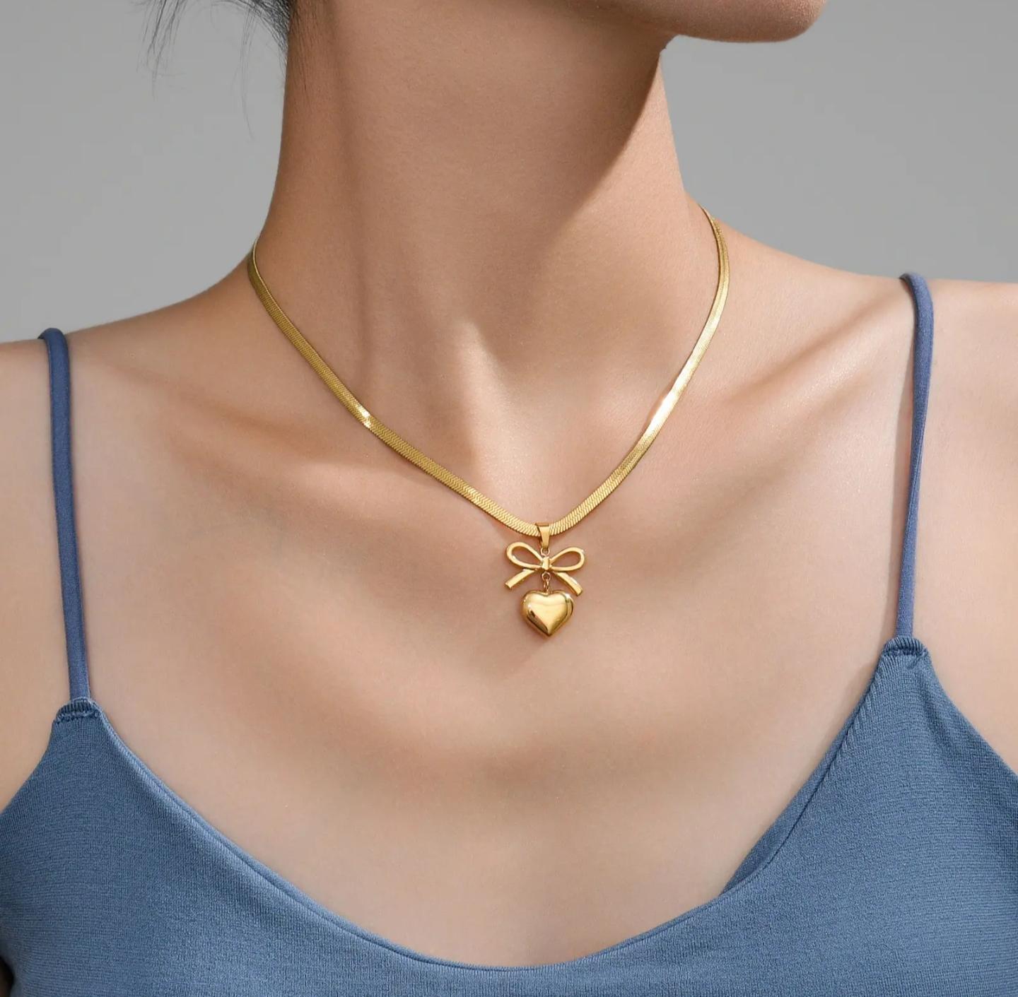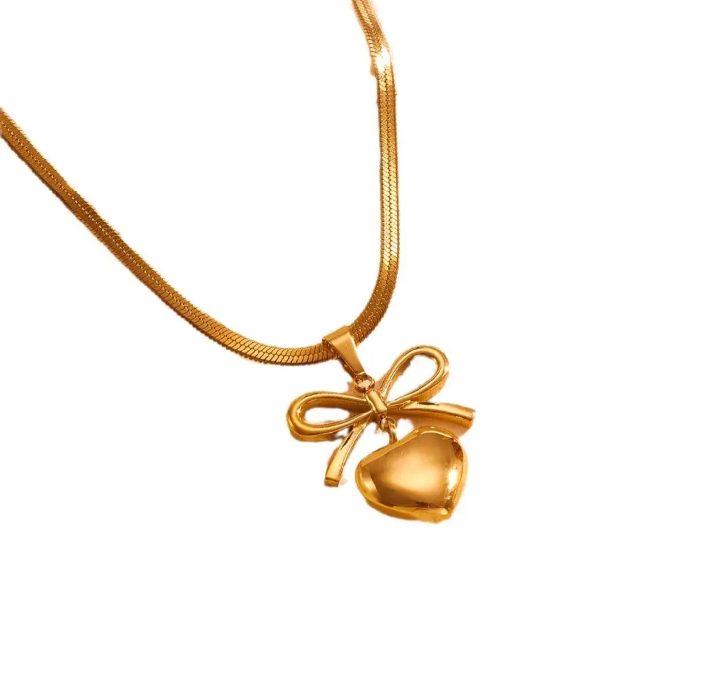 Elegant gold bow necklace with heart charm for a cute and stylish look.