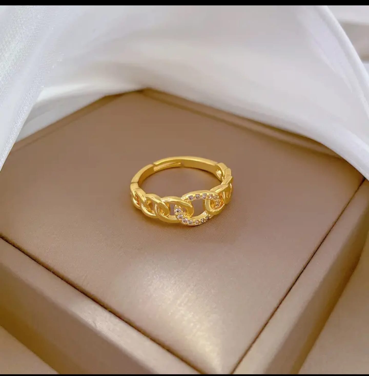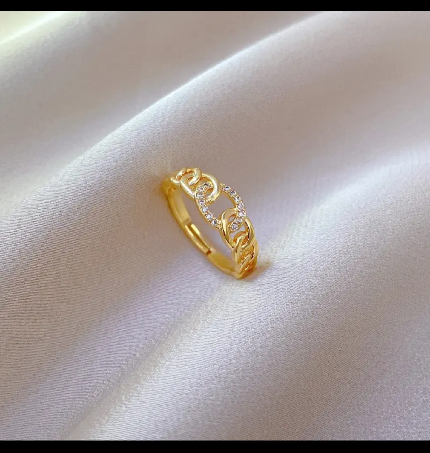 gold plated chain ring, chain link ring with stones, gold plated women’s ring, modern jewelry for women, small stones ring, gold plated jewelry for gifting, chain design ring, thick band gold plated ring