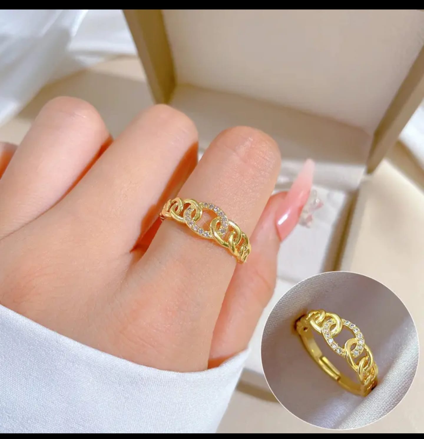 This gold plated chain ring is a stylish and elegant piece of jewelry designed for modern women who love to stand out. Featuring a chain link design with small stones or rhinestones on some links, it adds a touch of sophistication to any outfit. The ring is made from a metal base, most likely stainless steel or brass, with a gold plating that gives it a luxurious appearance. Its thick band ensures durability and comfort, making it suitable for everyday wear as well as special occasions. The modern style of the ring makes it ideal for parties, casual outings, and gifting to loved ones. Whether you’re looking to upgrade your personal collection or searching for a meaningful gift, this gold plated chain ring is a versatile accessory that complements both casual and formal attire. Store it in a jewelry box to protect the finish and maintain its luster over time. Its unique design and eye-catching appeal make it a must-have for any jewelry enthusiast.