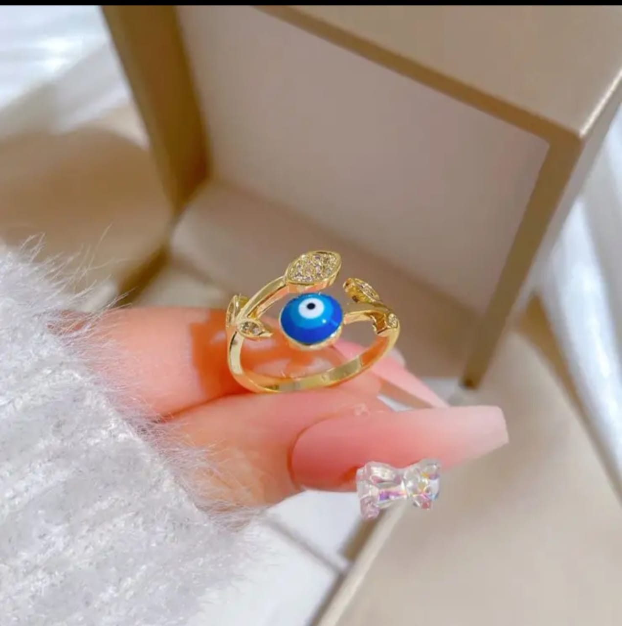 gold plated evil eye ring, adjustable fashion jewelry, blue and white evil eye design, women’s casual ring, modern evil eye accessory, fashionable women’s ring, casual occasion jewelry, symbolic gold plated jewelry