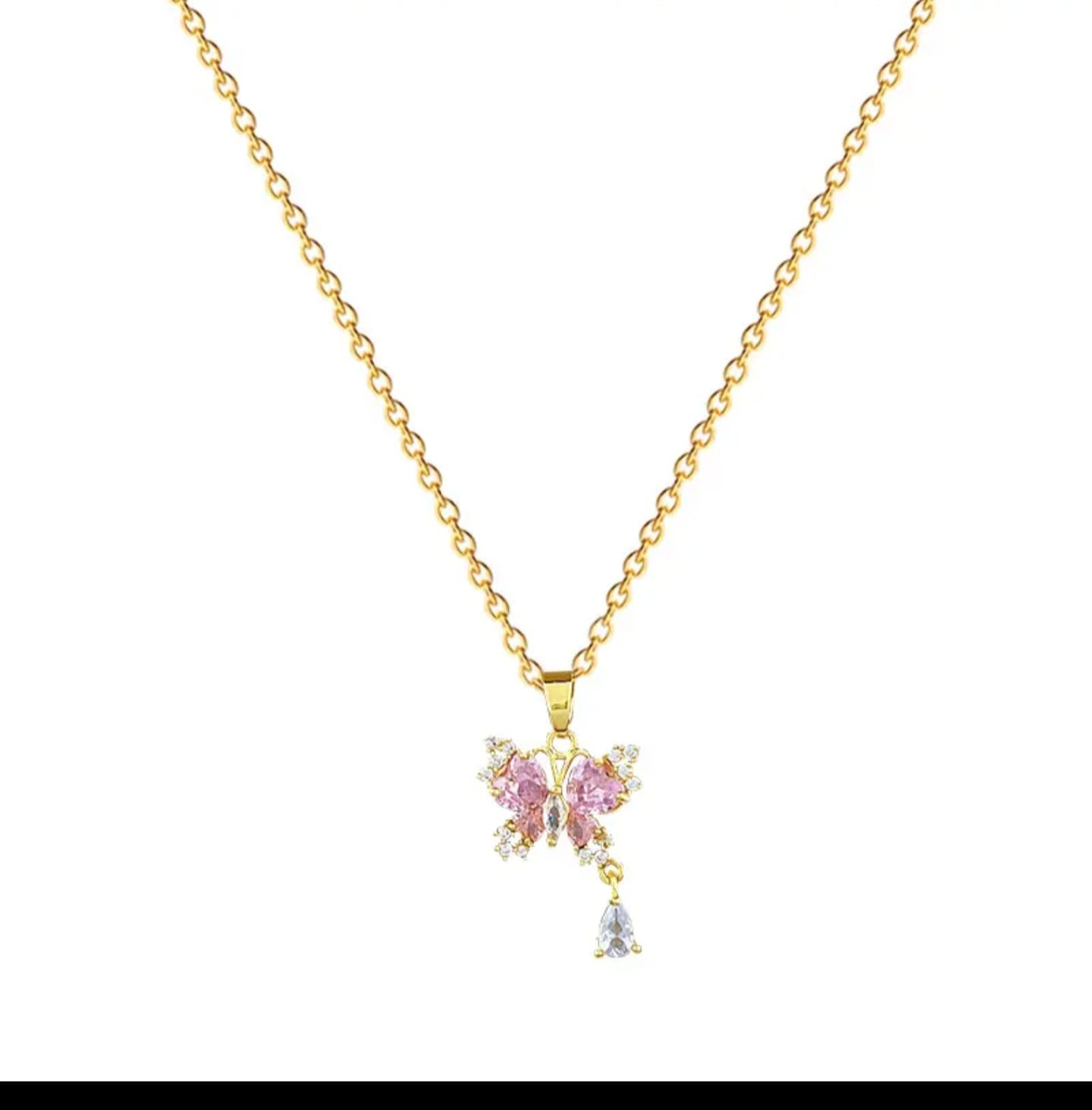 pink butterfly necklace, gold plated necklace, crystal necklace, butterfly pendant, women’s necklace, girls necklace, daily wear necklace, fashion jewelry, gift for her, pink jewelry, gold necklace, pendant necklace, crystal pendant, lightweight necklace, dainty necklace