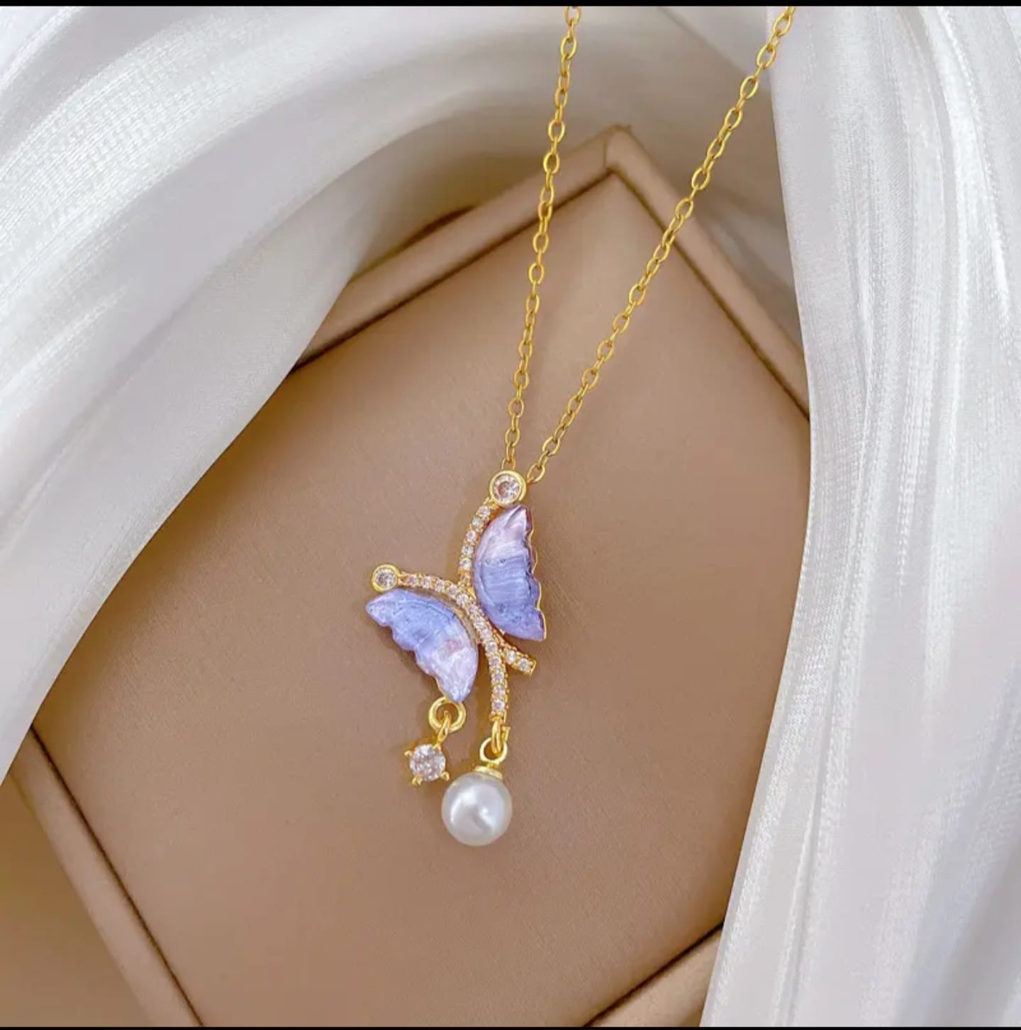 butterfly necklace, pearl pendant necklace, gold plated necklace, silver necklace for women, cubic zirconia necklace, lavender necklace, women’s fashion jewellery, girls necklace, festive wear necklace, casual wear necklace, gift for her, birthday gift for girlfriend, anniversary gift, party wear necklace, trendy necklace