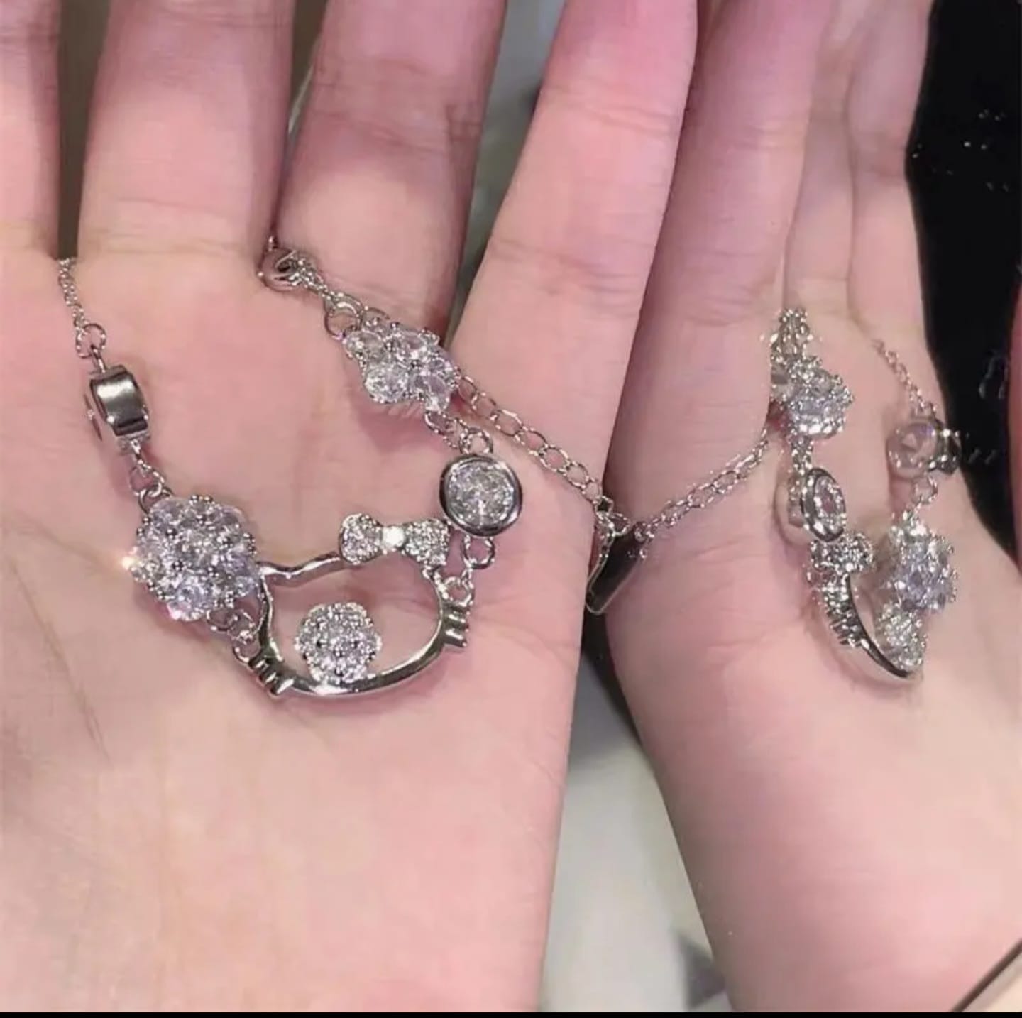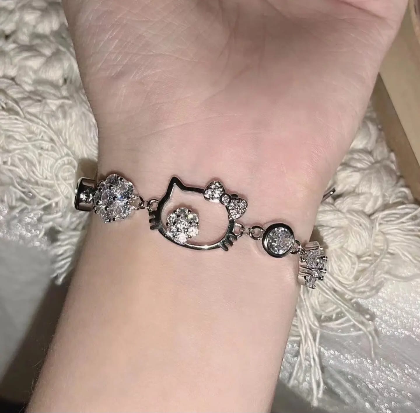 Add a touch of cuteness and sparkle to your style with the Kitty Crystal Charm Bracelet. Featuring an adorable kitty-shaped centerpiece adorned with shimmering crystals, this bracelet is perfect for those who love playful yet elegant accessories.