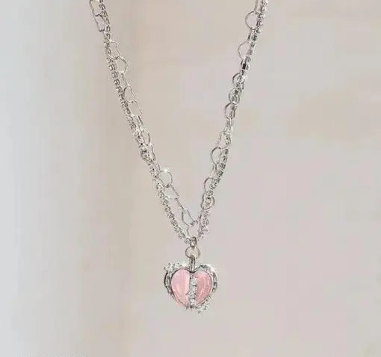 Elegant silver necklace with a pink crystal heart pendant, perfect for a romantic and eye-catching look.