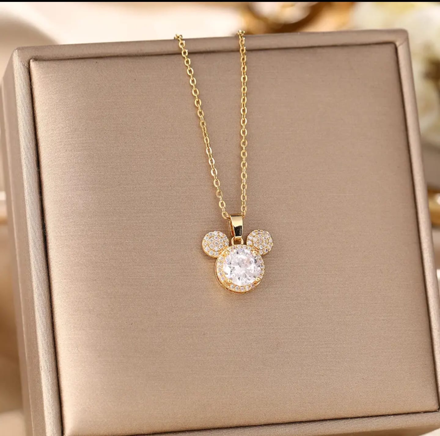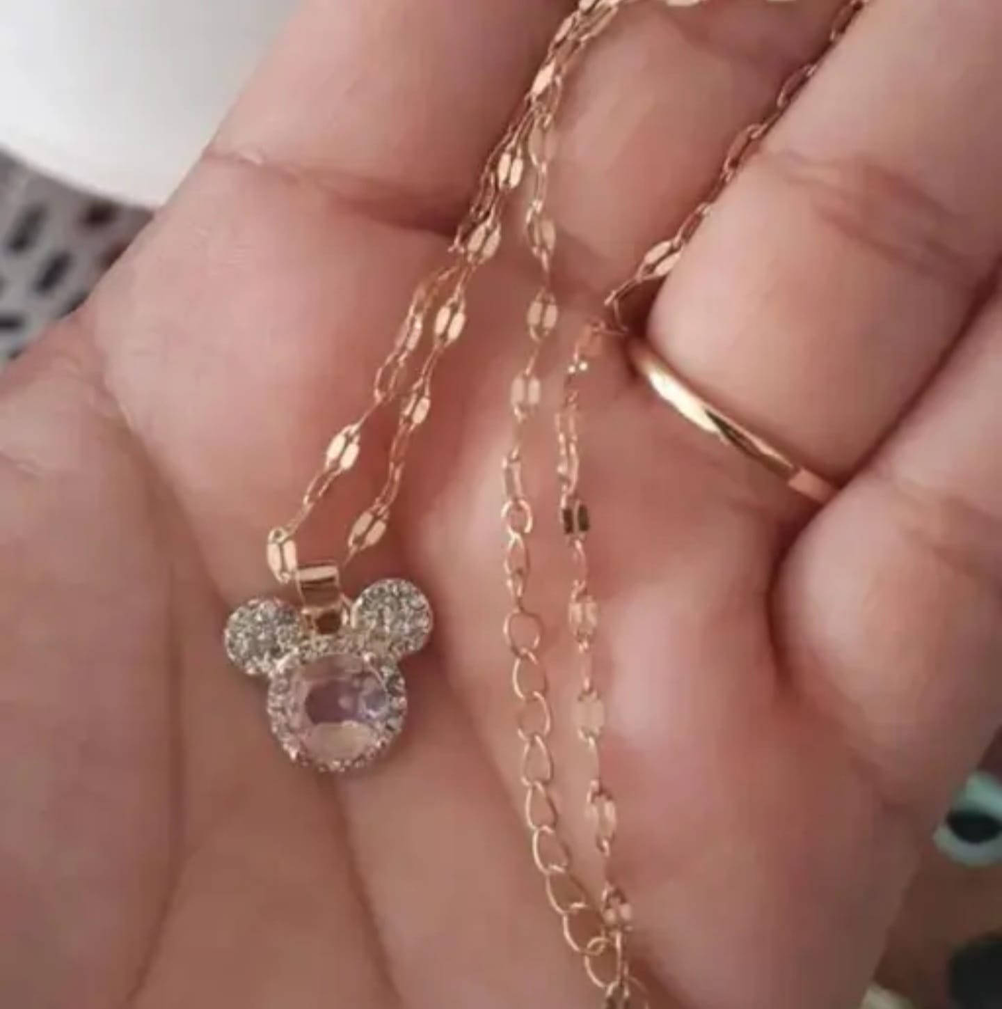 Cute gold necklace with a pink crystal mouse charm, perfect for a playful and stylish look.