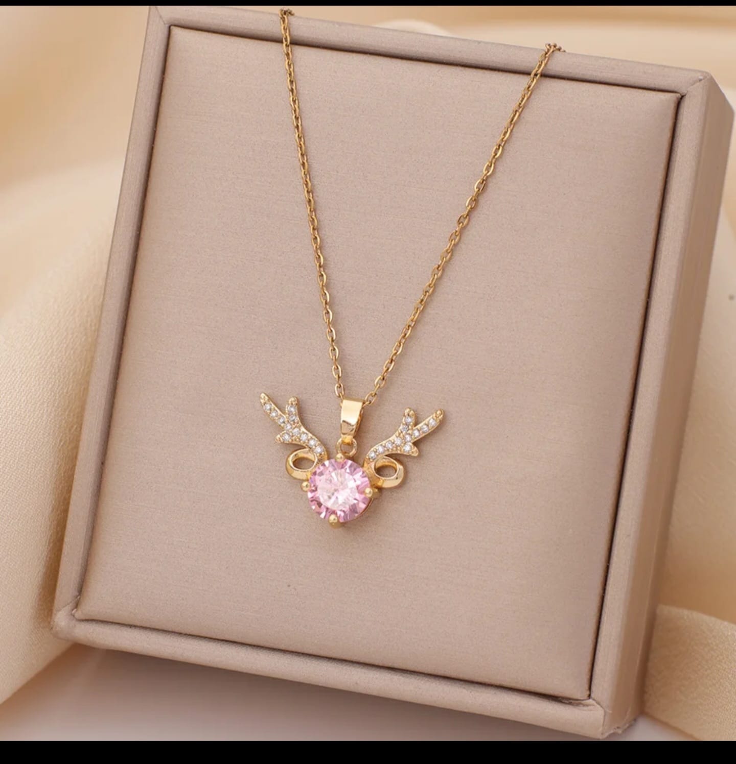 gold plated necklace, pink stone necklace, deer horn pendant, fashion jewellery, women’s necklace, party wear necklace, gift for her, artificial jewellery, gold finish necklace, adjustable chain necklace, pink pendant necklace, trendy necklace