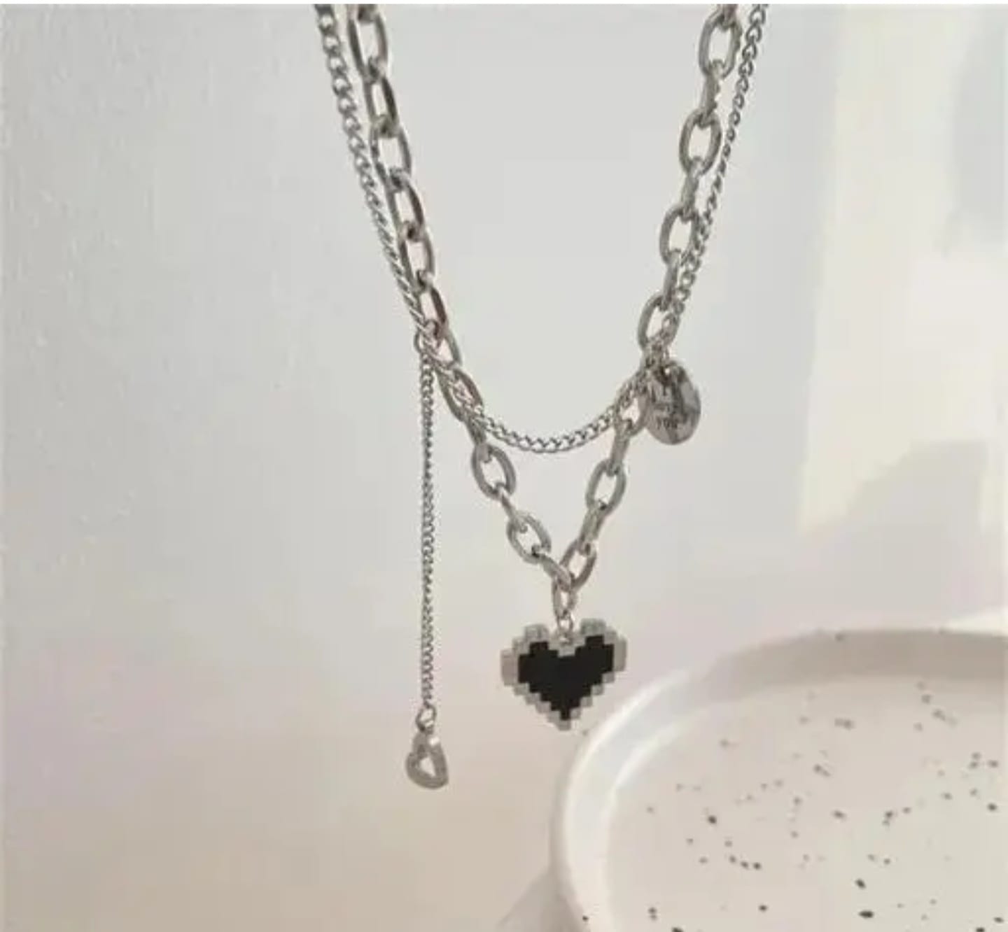 Trendy layered silver chain with pixel heart pendant for a bold, aesthetic look.