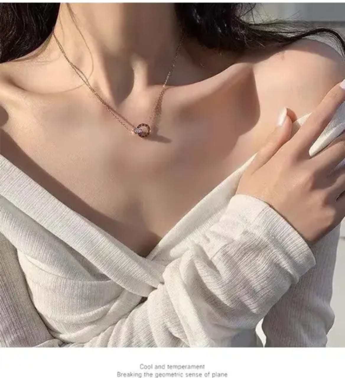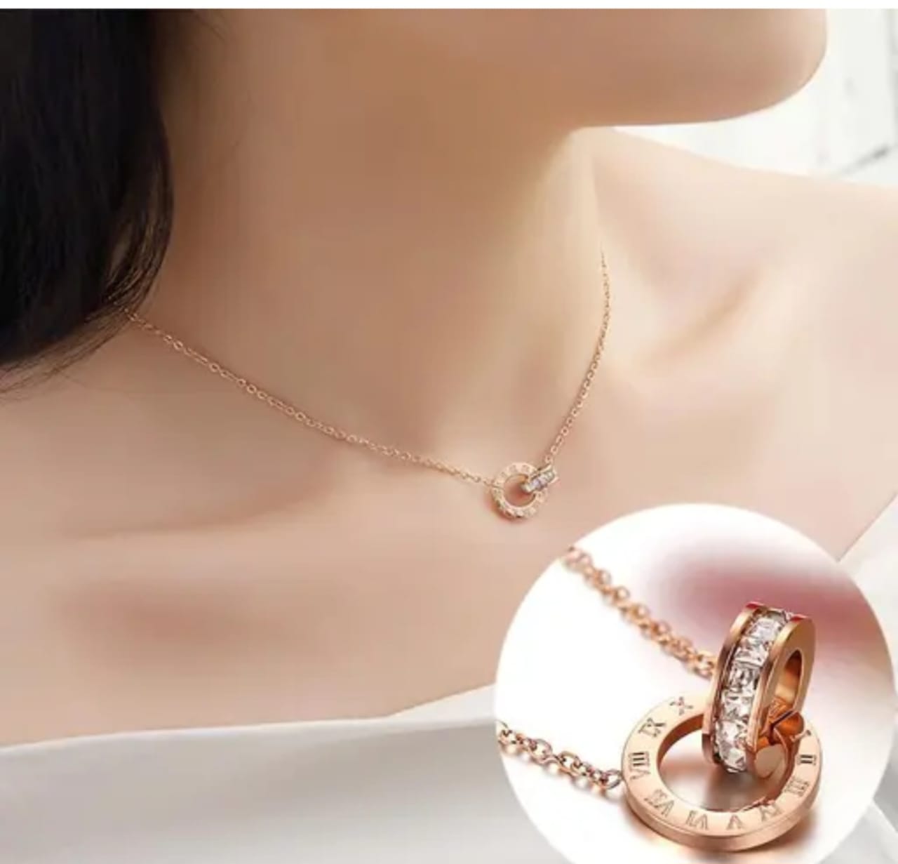 Add a modern and timeless touch to your style with this elegant double ring pendant necklace. Featuring interlocking rings engraved with Roman numerals and accented with subtle sparkling stones, this piece symbolizes connection, eternity, and sophistication.