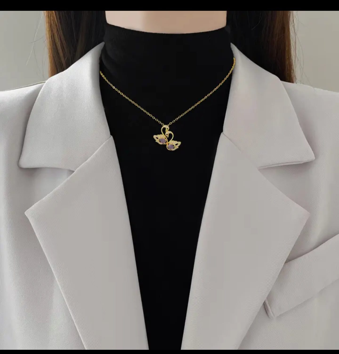 This exquisite gold plated swan necklace is a beautiful addition to any jewellery collection. Featuring two graceful swans embracing a vibrant purple stone, this piece embodies elegance and sophistication. Crafted with meticulous attention to detail, the necklace showcases a lustrous gold finish that complements the rich hue of the amethyst-colored stone. The delicate chain ensures comfortable wear, making it ideal for everyday styling or special occasions. This fashion jewellery piece is a thoughtful gift for birthdays, anniversaries, or simply to express your affection. The swan design symbolizes love, loyalty, and grace, adding a meaningful touch to this stunning necklace. It’s a versatile accessory that can be paired with various outfits, from casual to formal, enhancing your overall look with a touch of charm. Care for your necklace by avoiding contact with harsh chemicals and storing it in a cool, dry place to maintain its brilliance.