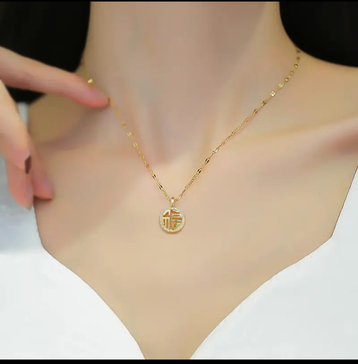 Gold Plated Lucky Charm Pendant Necklace for Women - Round 'Shou' Symbol with CZ Stones - Festive