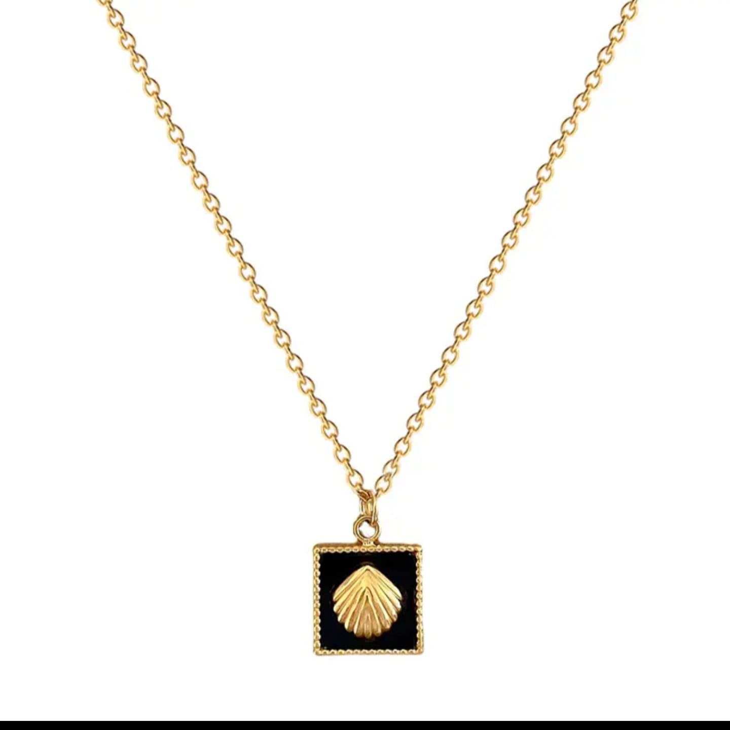 This stunning gold plated necklace features a unique square pendant with a delicate shell design, making it a versatile accessory for everyday wear or special occasions. Crafted with high-quality materials, this necklace offers a durable and lustrous finish that complements various outfits. The black and gold color combination adds a touch of sophistication, making it ideal for gifting to loved ones or treating yourself. The lightweight design ensures comfortable wear throughout the day, while the secure clasp keeps the pendant securely in place. This necklace is perfect for adding a subtle yet elegant touch to your style, enhancing your look with its timeless appeal. It’s a beautiful addition to any jewelry collection, offering a blend of classic and contemporary aesthetics. The necklace is designed to resist tarnishing, ensuring long-lasting shine and beauty. It’s a perfect choice for women who appreciate understated elegance and quality craftsmanship.