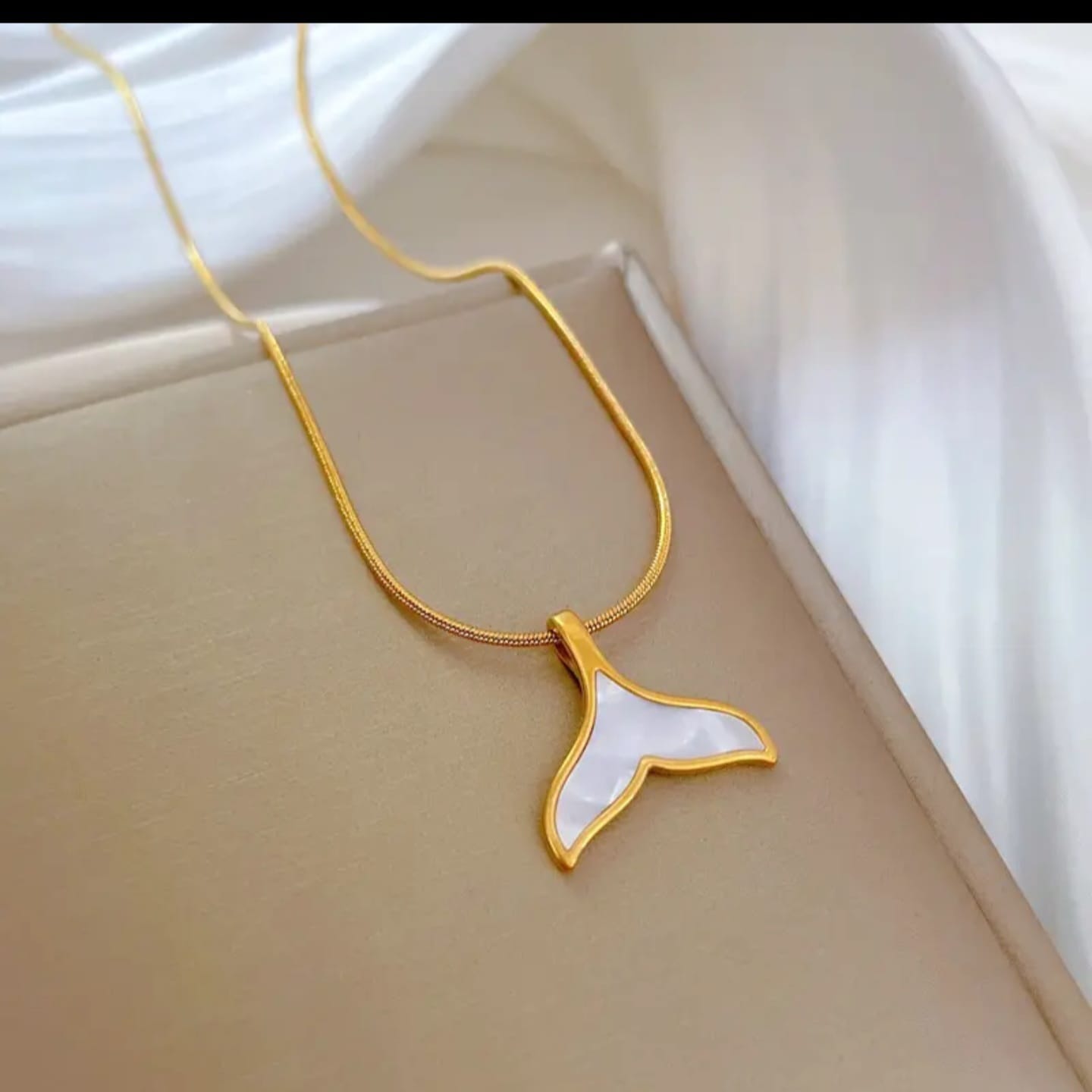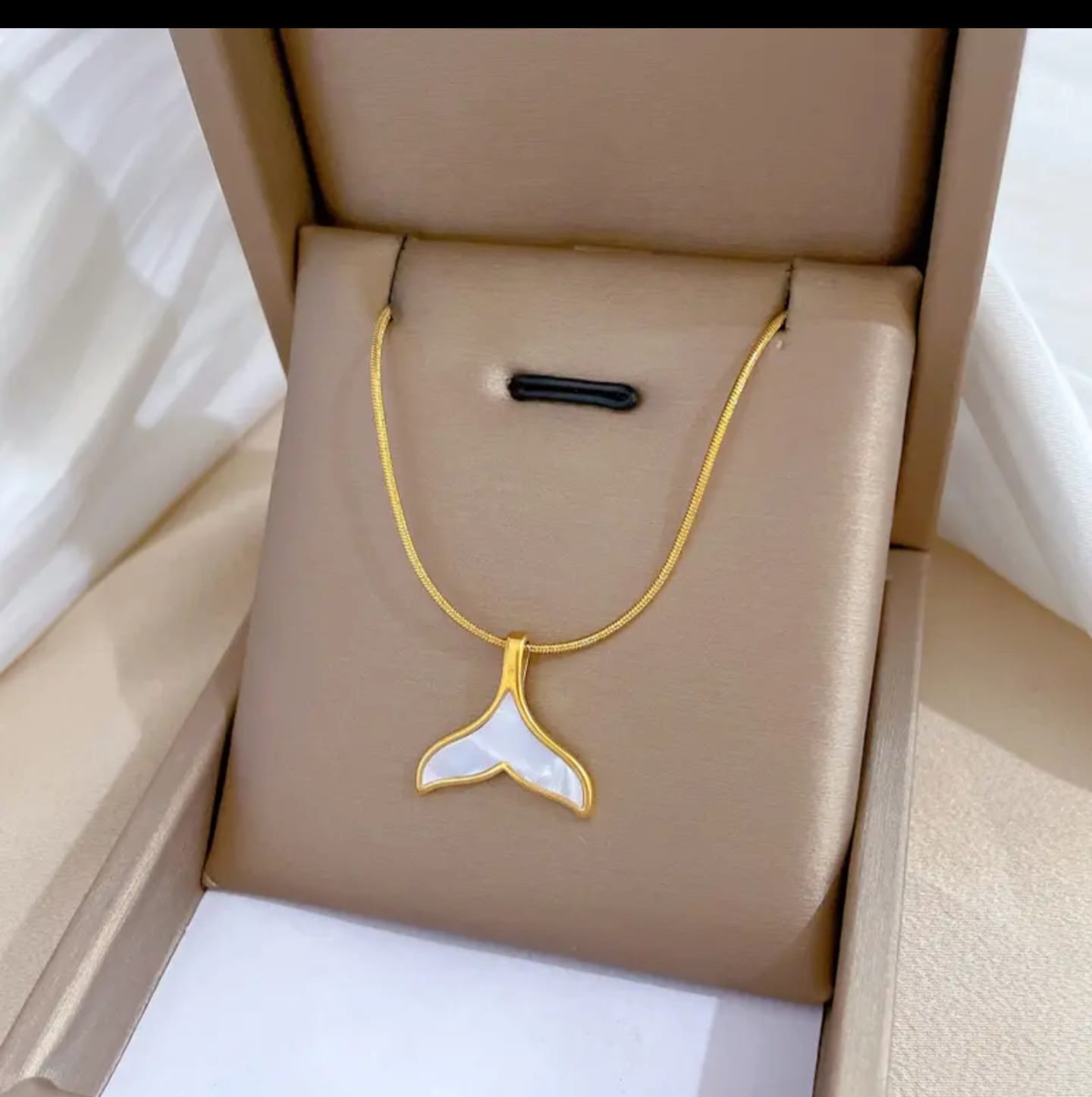 This exquisite necklace features a captivating mother of pearl tail pendant, delicately suspended from a lustrous gold-plated chain. The unique design adds a touch of oceanic charm to any outfit, making it ideal for both casual and semi-formal occasions. Crafted with attention to detail, this pendant necklace is lightweight and comfortable to wear throughout the day. The smooth, polished surface of the mother of pearl reflects light beautifully, creating a subtle yet eye-catching shimmer. This versatile piece is a wonderful addition to any jewelry collection and also makes a thoughtful gift for birthdays, anniversaries, or any special event. The secure clasp ensures the necklace stays securely fastened, providing peace of mind while wearing. Care for your necklace by avoiding harsh chemicals and storing it in a cool, dry place to maintain its brilliance.