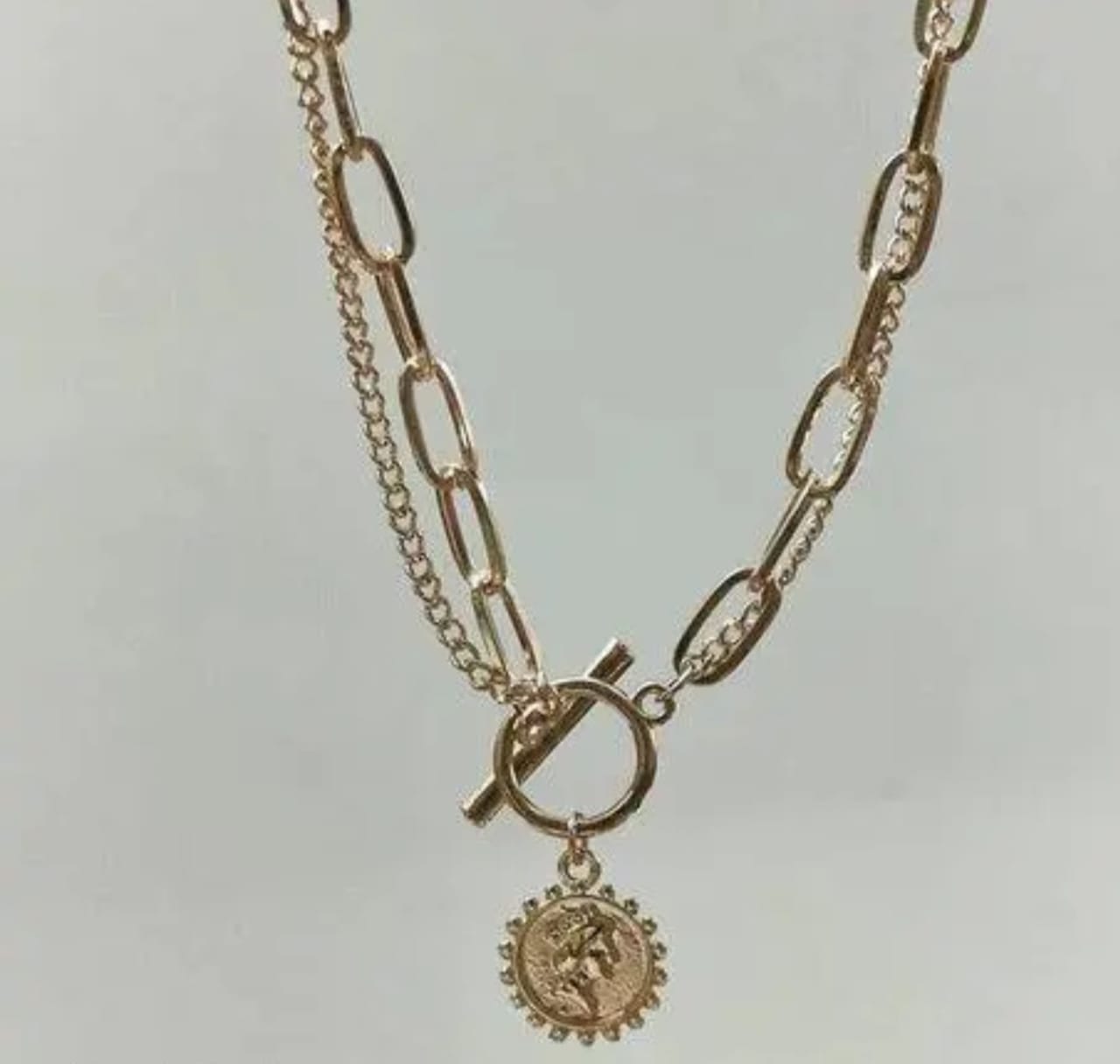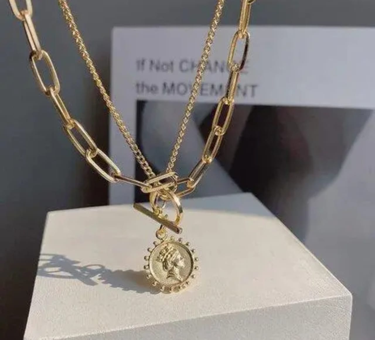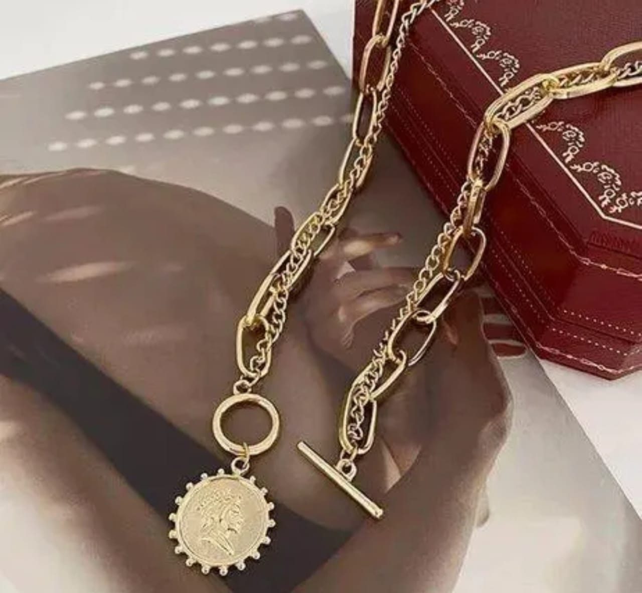 Elevate your style with this trendy vintage coin layered gold chain necklace, designed to make a bold and fashionable statement. Featuring a combination of sleek and chunky chains with a detailed coin pendant, this piece perfectly blends modern trends with classic vintage vibes.